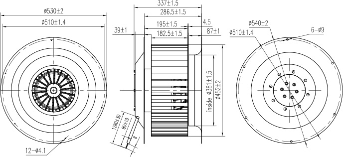 單進風(fēng)前傾式離心風(fēng)機根據(jù)風(fēng)機外形可分為蝸殼前傾式離心風(fēng)機和常規(guī)前傾式離心風(fēng)機兩種。蝸殼前傾式離心風(fēng)機共有120mm、133mm、140mm、150mm、160mm、180mm等六種。常規(guī)前傾式離心風(fēng)機有200mm、225mm、250mm、280mm、315mm、355mm、400mm、450mm等八種。