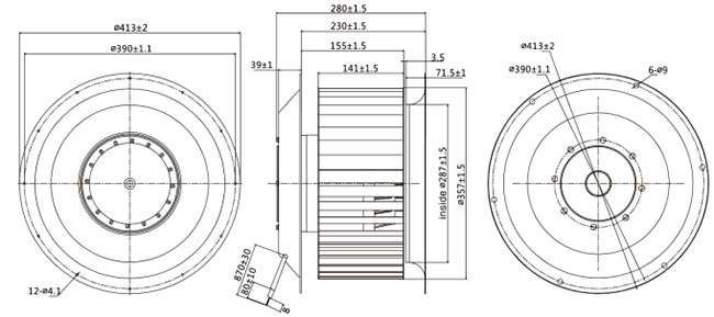 1. 性能參數(shù):風(fēng)輪直徑355mm,由4極和6極額定電壓為230/400V,頻率50Hz三相異步運轉(zhuǎn)電機組成。最大風(fēng)量分別為7000m3/h和4032m3/h,與之相對應(yīng)的轉(zhuǎn)速為1400rpm和870rpm。