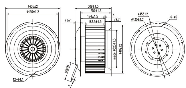 單進(jìn)風(fēng)前傾式離心風(fēng)機(jī)根據(jù)風(fēng)機(jī)外形可分為蝸殼前傾式離心風(fēng)機(jī)和常規(guī)前傾式離心風(fēng)機(jī)兩種。蝸殼前傾式離心風(fēng)機(jī)共有120mm,133mm,140mm,150mm,160mm,180mm六種風(fēng)機(jī)。常規(guī)前傾式有200mm,225mm,250mm,280mm,315mm,355mm,400mm,450mm八種風(fēng)機(jī)。