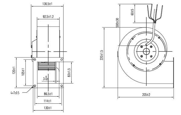 單進(jìn)風(fēng)前傾式離心風(fēng)機(jī)根據(jù)風(fēng)機(jī)外形可分為蝸殼前傾式離心風(fēng)機(jī)和常規(guī)前傾式離心風(fēng)機(jī)兩種。蝸殼前傾式離心風(fēng)機(jī)共有120mm、133mm、140mm、150mm、160mm、180mm等六種,常規(guī)前傾式離心風(fēng)機(jī)有200mm、225mm、250mm、280mm、315mm、355mm、400mm、450mm等八種。